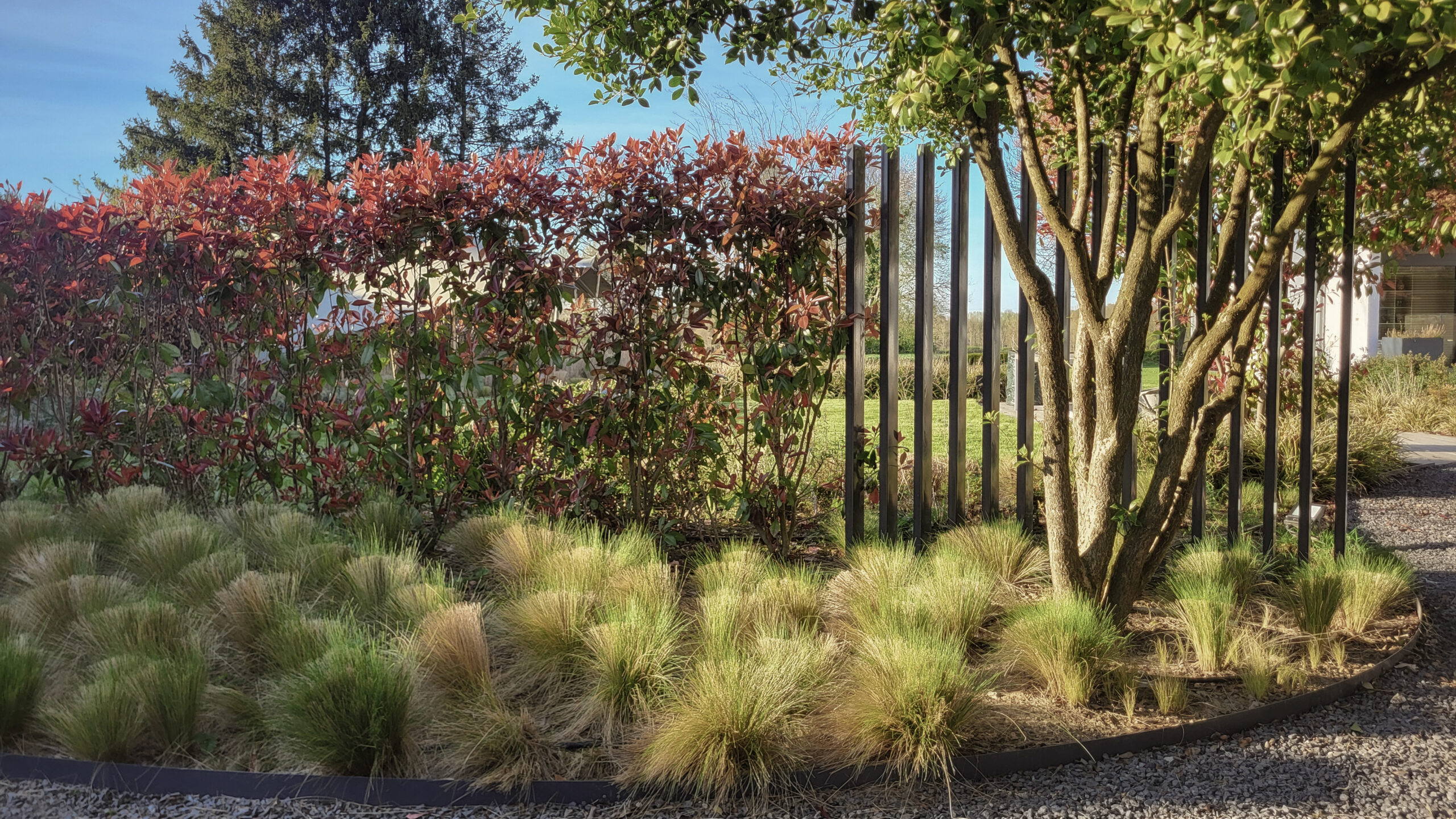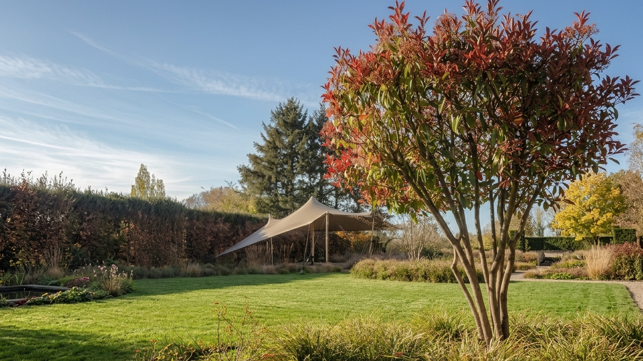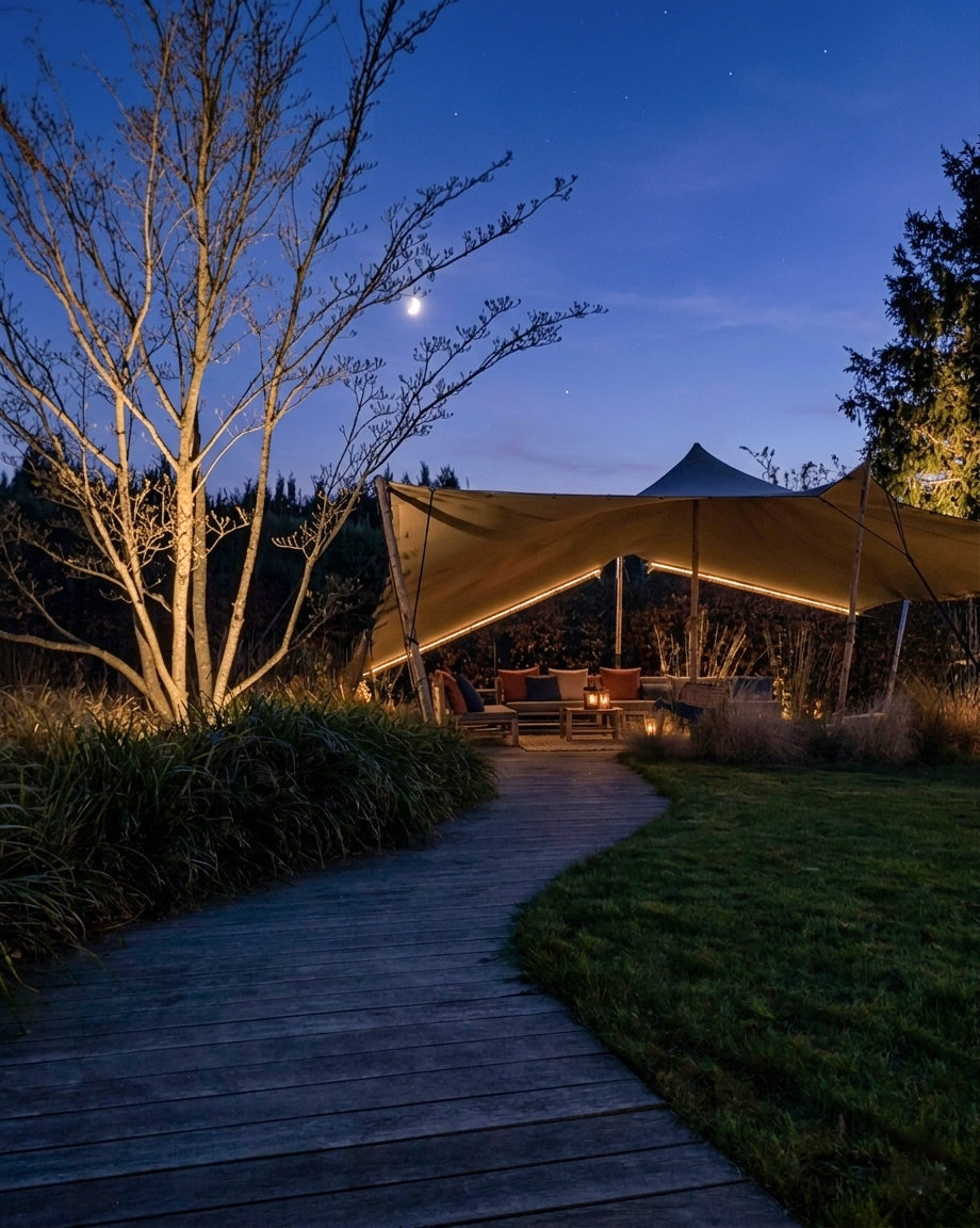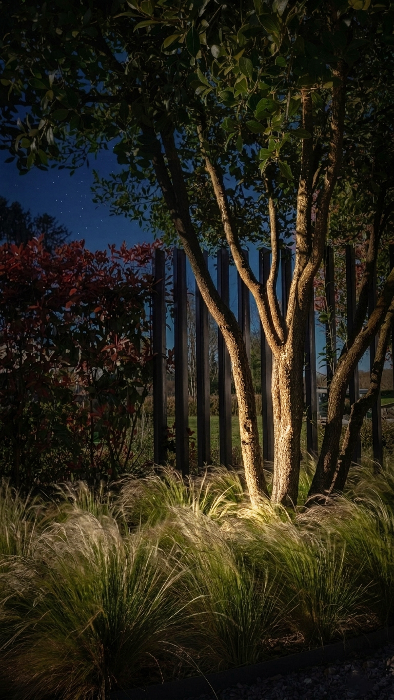 Exceptional specimen trees punctuate the landscape, acting as true living sculptures. Their imposing presence structures the garden without ever obstructing the view, thus preserving the depth of the field of vision. At nightfall, precise lighting highlights the architecture of the trunks, creating a hushed nocturnal atmosphere and an immediate invitation to relax.