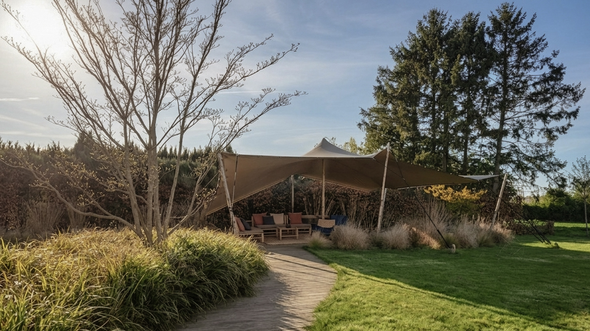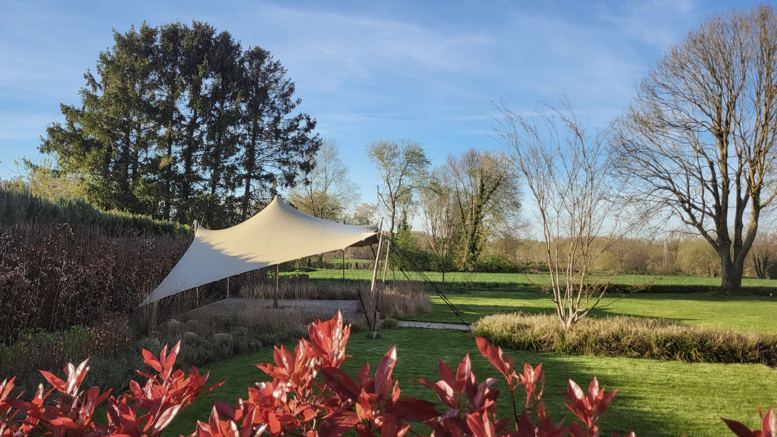 The integration of a Berber tent offers a privileged outdoor living area, making it possible to enjoy sunny days in the heart of a wild setting. The choice of plants, dominated by ornamental grasses, evokes the poetry and lightness of coastal vegetation, bringing a natural and constant motion to the entire grounds.